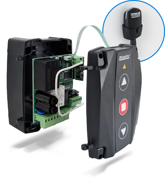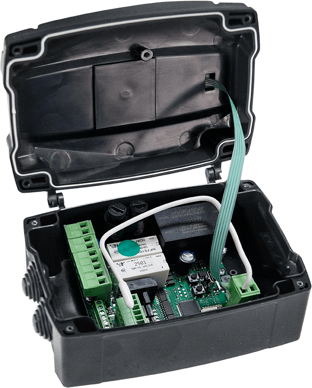 Elle dispose d’une alimentation universelle (100-240VAC), d’une capacité pour jusqu’à 120 émetteurs et de fonctions d’autotest pour photocellules et bords de sécurité 8K2.